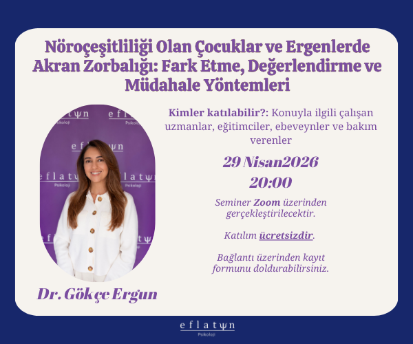 Dr. Gökçe Ergun tarafından 29 Nisan 2026 saat 20.00'da Zoom üzerinden gerçekleştirilecek "Nöroçeşitliliği Olan Çocuklar ve Ergenlerde Akran Zorbalığı: Fark Etme, Değerlendirme ve Müdahale Yöntemleri" konulu seminerimize ilginiz için teşekkür ederiz.