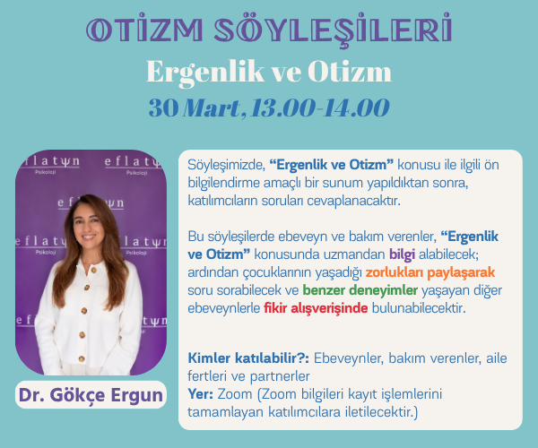 Söyleşimizde, “Ergenlik ve Otizm” konusu ile ilgili ön bilgilendirme amaçlı bir sunum yapıldıktan sonra, katılımcıların soruları cevaplanacaktır. Bu söyleşilerde ebeveyn ve bakım verenler, belirlenen konuda uzmandan bilgi alabilecek; ardından çocuklarının yaşadığı zorlukları paylaşarak soru sorabilecek ve benzer deneyimler yaşayan diğer ebeveynlerle fikir alışverişinde bulunabilecektir.